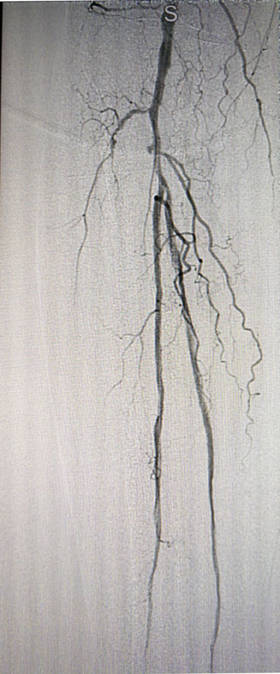 放射科导管室内做好了术前准备,患者由无创呼吸机及各种循环支持下开始介入手术,术中重症监护科严密观察患者的生命体征,内分泌科医生负责手术,患者下肢血流极差,膝下仅存一条多处严重狭窄的腓动脉供血,主要供血的胫前动脉及胫后动脉均长段闭塞,顺行穿刺成功后导丝下行困难,故采用踝下胫后动脉逆穿对接技术成功通过病变。经过近5个小时的奋斗,手术顺利完成,患者腓动脉及胫后动脉血流通畅,血流直达足底动脉环,患者感到足部逐渐温暖,术后清创时患者创面血流丰富。