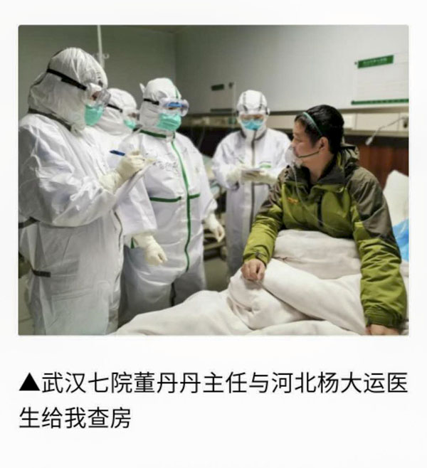 25床王叔,是我来武汉市第七医院护理的第一个病人,我也一直在关注他的病情。看过他拍的CT片子已经是大白肺了,一直依靠着鼻导管加无创呼吸机,双回路吸氧,血氧饱和度仅仅能维持在88%左右。他告诉我,为了能够让血氧饱和度上升到90%以上,他坚持不吃饭不喝水。我能感觉到他强烈的生存愿望,给他加油打气,希望能够给他一线生的机会,帮他渡过难关。可是很不幸,在211日下午血氧饱和度急剧下降,经过多方面沟通决定气管插管,这项操作在我们科几分钟便能搞定,但是在这种情况下插管的危险度可想而知,开放的气道,呼出的气体,飞溅出来的痰液,弥漫在空气中的气溶胶对我们来说,每一项都是很大的考验,但是在医护配合默契的情况下成功插管,平安转入ICU进行下一步的生命支持。在心里默默为他加油,希望他能够尽早脱离危险。