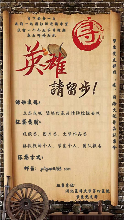 我院学生党支部以“众志成城,坚决打赢疫情防控阻击战”为主题,在教师和学生当中征集视频、文字、图片等抗击疫情的宣传作品,引导学生们在防控期间凝心聚力,冷静思考,传播正能量,弘扬医院文化。