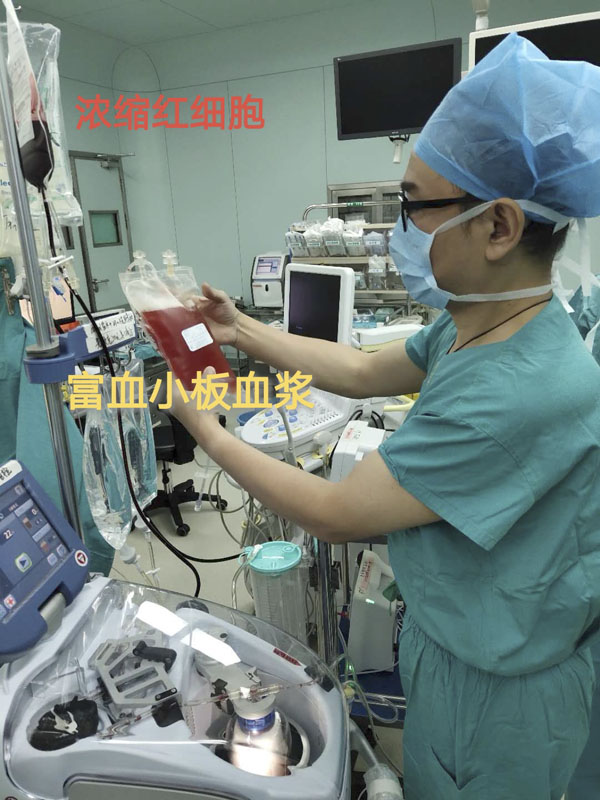 患者李女士就诊于我院心血管外科,术前诊断为升主动脉瘤,医生决定对其进行全麻体外循环辅助下行升主动脉置换+主动脉半弓置换术。考虑到该手术复杂、历时较长、且在深低温体外循环下进行,患者凝血功能将受到极大影响等,为纠正机体凝血功能,经过认真评估和充分准备,麻醉一科为该患者精准实施术前自体血液分离技术,该技术为术前经中心静脉抽取1100毫升自体血,利用血液回收机将全血分离为富血小板血浆700毫升、浓缩红细胞400毫升,即刻回输浓缩红细胞,留存富血小板血浆,待术毕前回输机体。手术历时9小时,其中深低温体外循环3.5小时,患者术后恢复顺利。