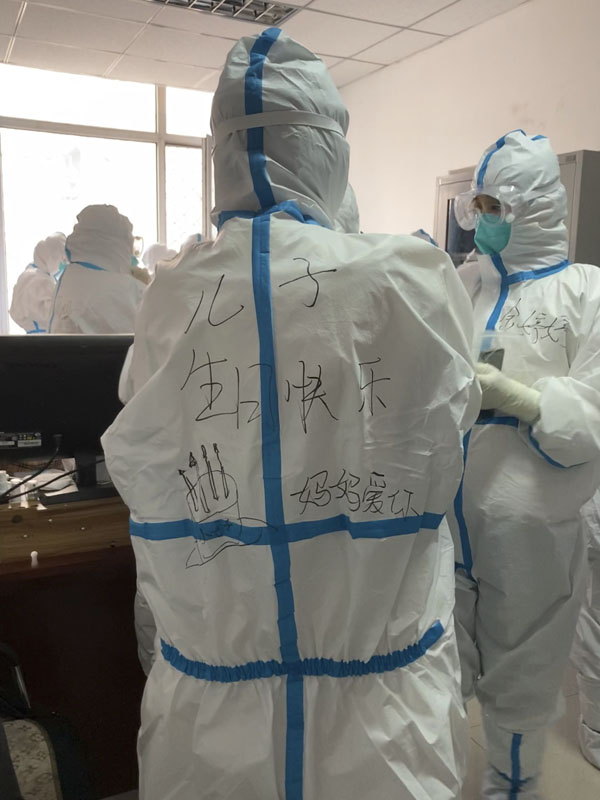 口泌外科的李云娇从16日开始就一直参与核酸采集工作,她记不清有多少天没有见到女儿和儿子了,今天是她小儿子的4岁生日,她把祝福写在防护服上,让这个别样的生日更有意义。手术室徐欣华带领队员率先承担高风险单元的采集任务,同时还帮助其他小组分担工作。由于上轮执行核酸采集任务时气温太低,耳鼻喉科高超的手部出现冻伤,多年的腰疾也因着凉复发,一度累得站不起来。此次,她还是勇敢地站在了外采的队伍中。消化内科的张茜,未告知大家刚下夜班,毅然加入到队伍中。出征前,放疗科张钧主任医师和耿文慧护士长还为本科室的张媛媛准备了御寒棉衣。