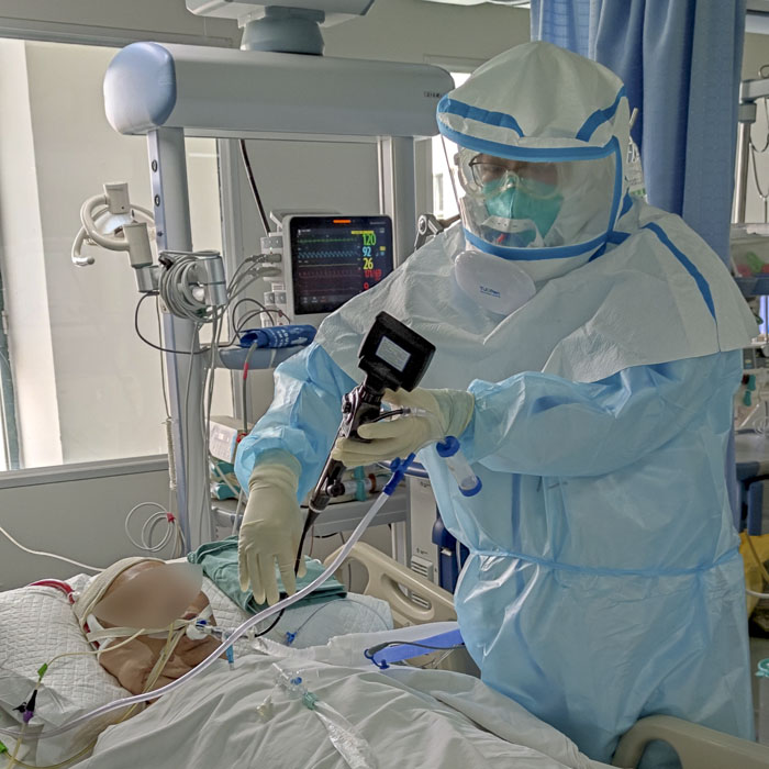 病区里有多名重症患者,每天都要完成气管镜检查,以观察气道粘膜并收集气道分泌物。检查过程中,患者气道开放会产生大量飞沫或气溶胶,具有极高的感染风险,对操作者的心理和技术要求都很高。为了保障安全,操作前需要在常规防护服外穿戴隔离衣和防护头罩,这让原本就不顺畅地呼吸变得更加艰难,每一个动作都变得吃力了许多,原本正常状态下几分钟就能结束的操作,现在都需要二十分钟以上才能完成。面对这种复杂情况,我率先行动、迎难而上,不仅因为我是一名有着10多年气管镜操作经验的医生,更因为我是一名有着20多年党龄的老党员。