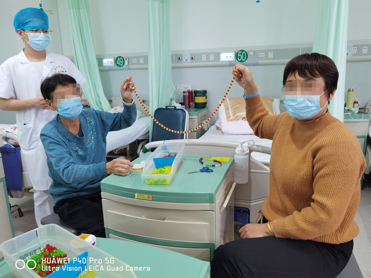 手工制作由胡新彦老师主持,为患者及家属准备了五种颜色的串珠和玻璃绳,大家兴致很高,使得“严肃”的病房在瞬间变成了