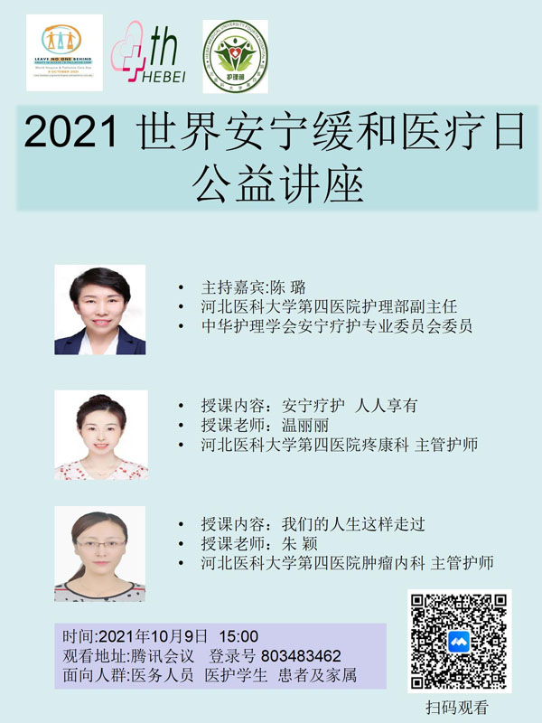 线上公益讲座由陈璐副主任主持,温丽丽护士以《安宁疗护 人人享有》为题,从安宁疗护的起源、了解学习安宁疗护的必要性及安宁疗护的误区等多方面进行了介绍,强调安宁疗护是更有针对性、更积极有效地治疗方法;朱颖护士以列车喻人生,讲述如何走好生命中最后的旅途。陈璐副主任在总结中讲到,“面对生命末期患者,应充分尊重,助其提高生活质量。”