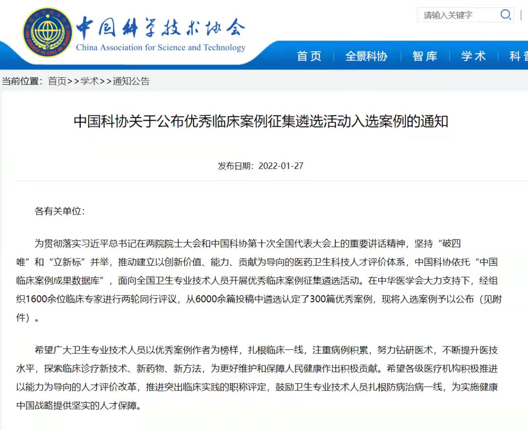 我院2个案例入选中国科协优秀临床案例征集遴选活动