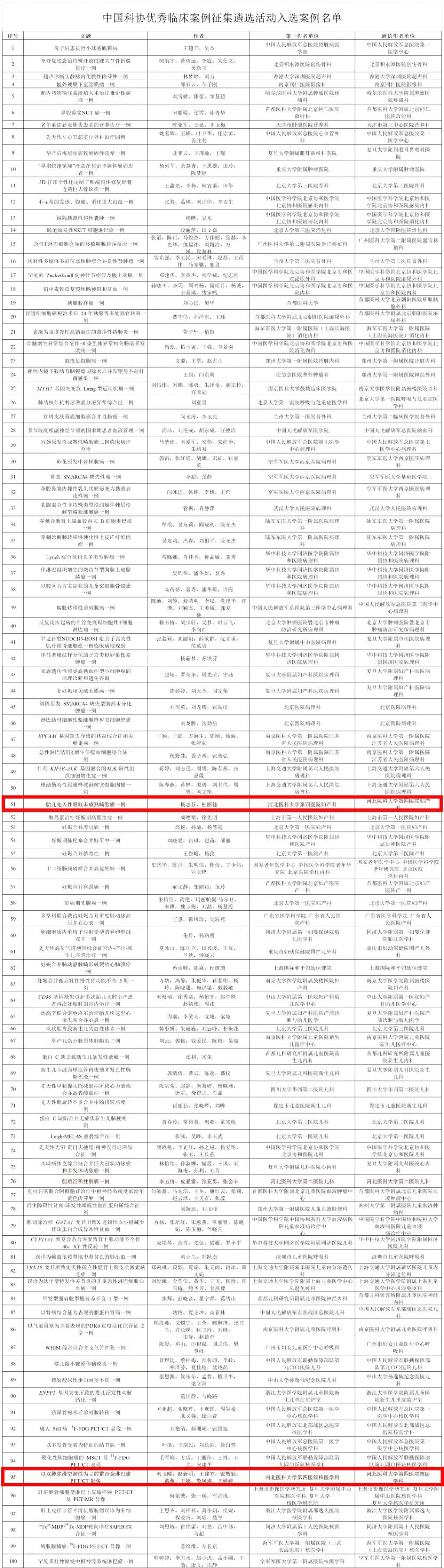 127日,中国科协公布优秀临床案例征集遴选活动入选案例的通知,本次优秀临床案例征集遴选活动组织1600余位临床专家进行两轮同行评议,从6000余篇投稿中遴选认定了300篇优秀案例,其中,我院2篇案例成功入选。他们分别为:河北医科大学第四医院妇产科“胎儿先天性眼眶未成熟畸胎瘤一例”、河北医科大学第四医院核医学科“以双肺弥漫空洞性为主的霍奇金淋巴瘤 PET / CT 影像”。