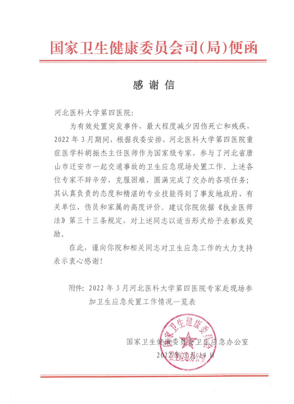 来自国家卫健委的感谢信!胡振杰主任应急处置受称赞