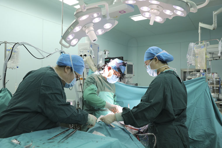 4月11日傍晚至4月12日凌晨,历经一整夜的艰苦奋战,在麻醉科、体外循环小组、手术室、输血科、介入科的协作下,心脏血管外科赵永波副主任团队紧急为外地转来的一名危重A型主动脉夹层患者进行“升主动脉置换+主动脉全弓替换”手术,为有效改善患者的远期预后情况,赵永波同期进行了主动脉远端介入治疗。这场历时13个小时的抢救性手术最终顺利结束,患者术后安返心脏血管外科重症监护病房,恢复良好。