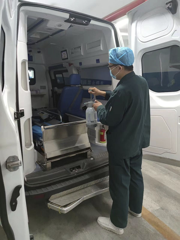 120救护车是“移动战场”,在疫情常态化防控背景下,每次完成接收、转送发热疑似患者的任务后,不管多累、多晚,护士们都要认真消杀救护车,不放过任何死角。