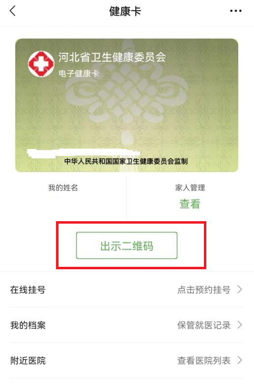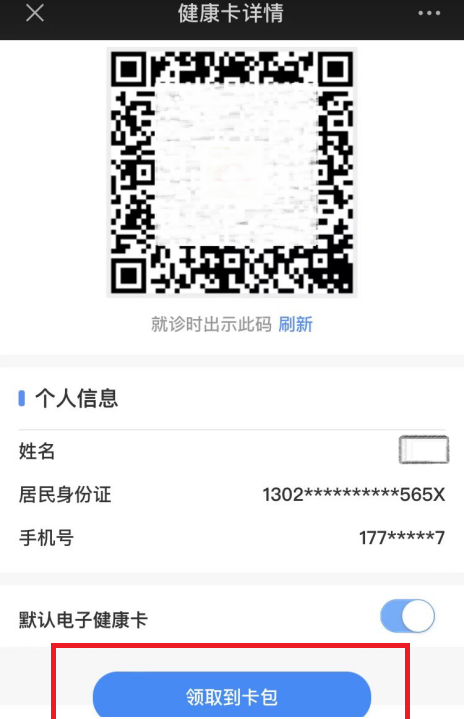 申领成功后,点击电子健康卡界面,将打开二维码。该二维码为在我院就诊时的电子凭证,可在医院门诊完成全部就诊流程。为了方便就诊,可以点击“领取到卡包”,将电子健康卡存入微信卡包便于出示。
