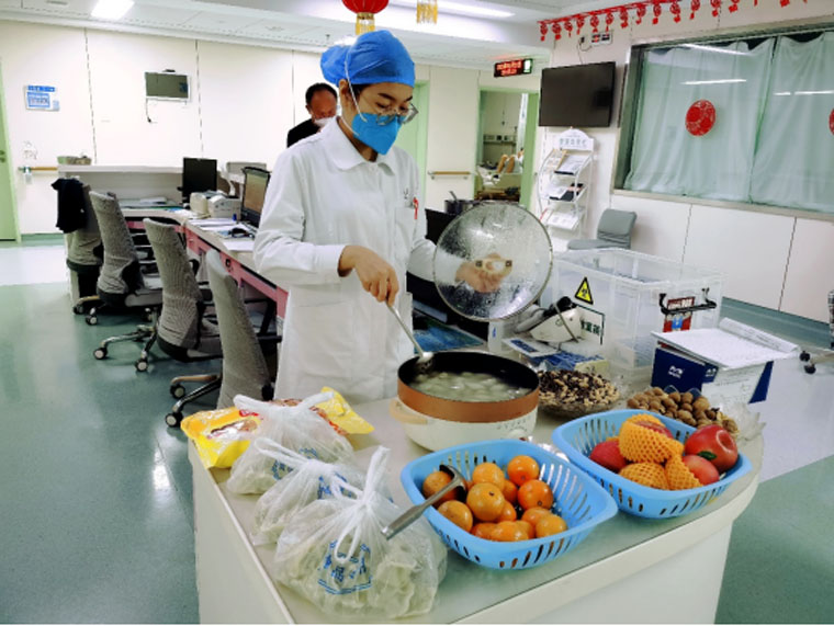 除夕夜,胸五科值班护士及医生为在院患者送去热腾腾的饺子、水果和最真挚的祝福,让大家感到家一般的温暖。