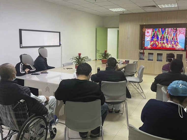 除夕夜,胸六科医护人员精心布置科室,在保障正常工作的前提下,组织患者家属一起收看春节晚会,共迎新春。