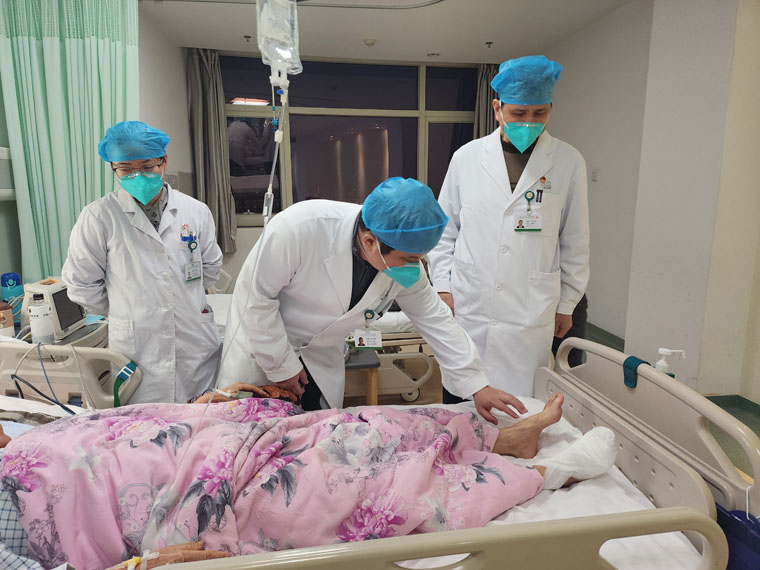 节后第一名患者是72岁的女性,糖尿病史40多年,双足麻凉、疼痛、右足趾坏疽,由于右足第23足趾已缺血坏疽,患者足部疼痛难忍,彻夜难眠,就诊于我院急诊。内分泌科王富军主任带领两名年轻医师和导管室医务人员密切配合,成功为患者实施了右下肢动脉造影及球囊扩张术,开通了直达足部的血流,症状即刻缓解。患者激动地表示省四院内分泌科救了我的脚,救了我的命啊!