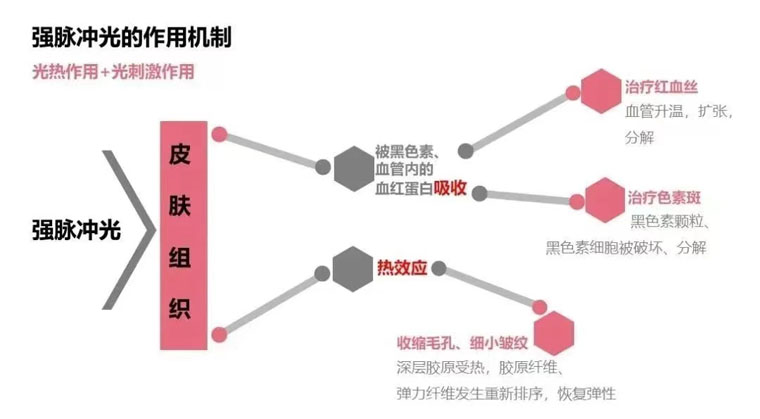 光子宽光谱所产生的光热及光化学作用可使皮肤真皮层的胶原及弹力纤维分泌增加重新排列,达到减少细纹、细致毛孔等抗衰嫩肤的作用,在真皮层年轻化的同时, 表皮的皮肤问题如:色斑、暗沉情况均会达到同步改善。
