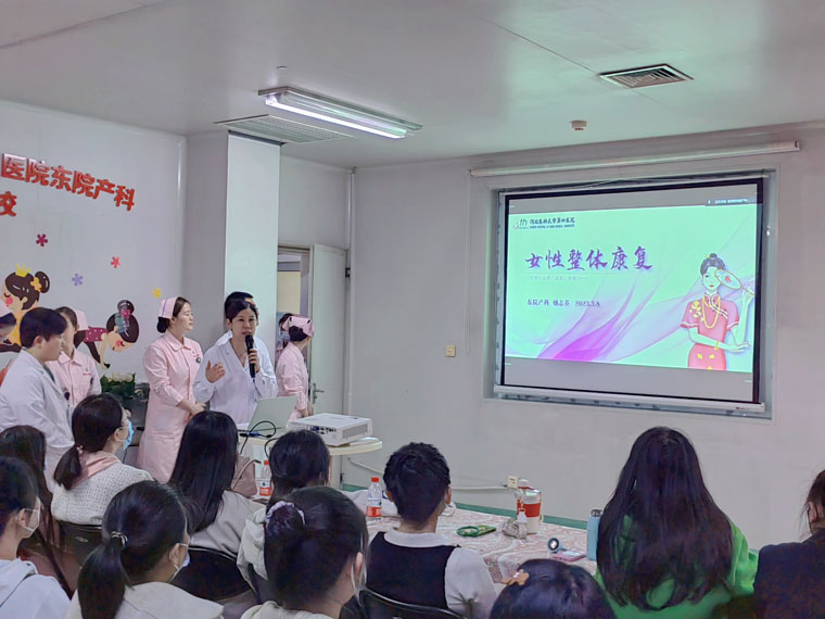 产科副护士长任玮娜主持活动。医护人员与孕妈妈们合唱《相亲相爱一家人》。随后,东院产科副主任杨志芬围绕“产后女性身心整体康复”进行科普讲座,她指出,随着年龄增大,女性在经历了妊娠、分娩等过程后,面临身材走样、盆底肌受损、腰背疼痛、腹直肌分离、乳腺肿胀、焦虑甚至抑郁等问题。盆底肌受损易造成漏尿、尿失禁、性生活质量差、性生活不和谐、盆腔脏器脱垂等问题,对正常生活造成不便。她介绍了目前东院产科正开展中医产后康复、WAFF孕产运动、孕产瑜伽、电刺激联合生物反馈等综合康复技术,可帮助女性朋友安全、科学、有效地进行产后乳腺疏通、腹直肌/耻骨联合分离修复、盆底肌康复以及心理舒缓疗愈,有利于产妇全面恢复身心健康。