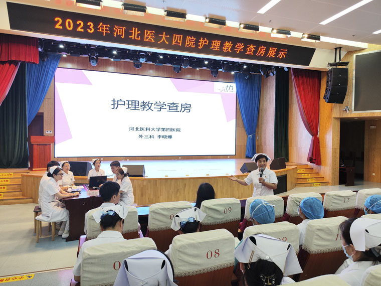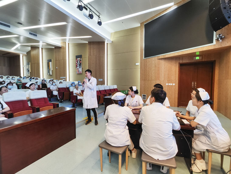 为规范护理教学查房流程,提高临床护理教学能力,8月1日,护理部在新医技病房楼报告厅举办“医护融合护理教学查房展示活动”。外三科刘庆伟副主任医师、带教老师李晓娜及5名实习生组成查房展示团队,护理部李来有主任,护理教学办公室李志红主任、范晓丹老师以及全院各科护士长、带教老师、教学骨干和部分实习生300余人参加。本次培训得到外三科的帮助和支持。