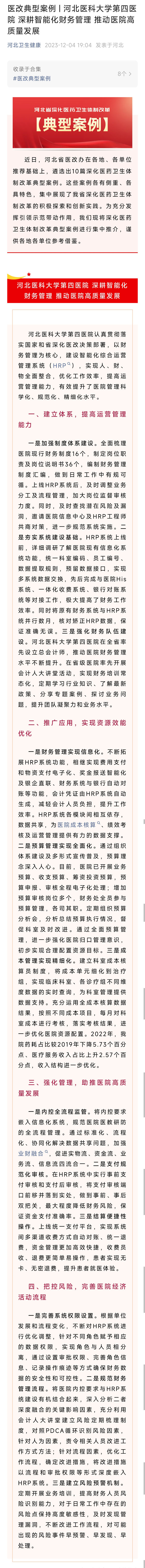 在院党委的正确领导下,2018年,我院智能化综合运营管理系统(HRP)成功上线。历经6年的不懈探索,该系统持续完善升级,显著提升了医院的精细化管理水平,被河北省医改办遴选为深化医药卫生体制改革的典型案例。我院将继续深化改革,积极应用现代科技手段,大力推进智能化财务管理工作,助推医院实现高质量发展,为增进人民群众健康福祉贡献力量。