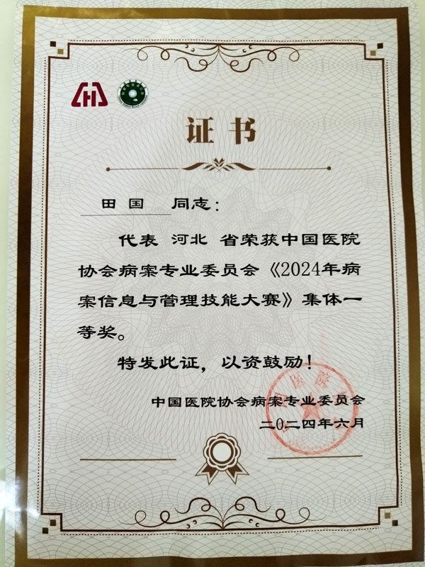 6月19-21日,中国医院协会病案专业委员会第31届病案学术年会在厦门召开,主题为“ICD技术助力医疗改革,中国病案与祖国同行”,病案室李书梅主任做了学术报告。期间召开了“第二届全国病案信息与管理技能大赛”,我院病案室田国作为河北省队代表之一,在全国29个省、自治区、直辖市的参赛队伍中脱颖而出,荣获全国集体一等奖。