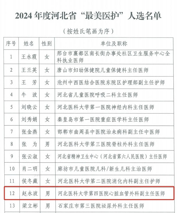 此前,经各市、省直卫生健康单位推荐及省级综合评定,省委宣传部、省卫生健康委、省总工会决定,授予我院心外科赵永波副主任医师等15名同志2024年度河北省“最美医护”称号。