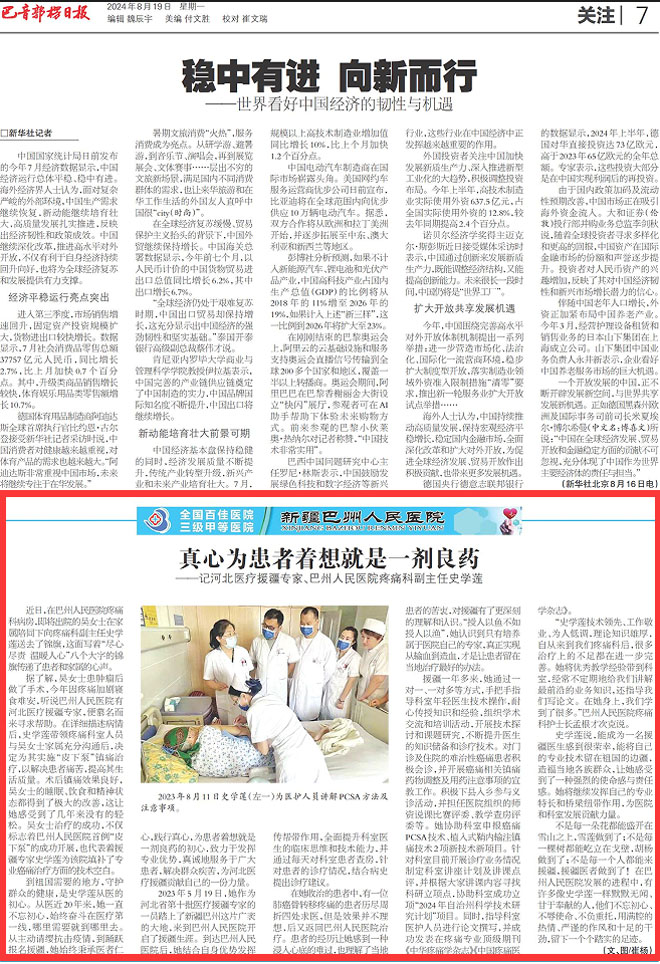 2023年5月19日,我院神经外科刘英姿、肿瘤内科崔彦芝、放疗科宋玉芝、疼痛康复科史学莲,作为我省第十批援疆干部人才集体赴新疆巴州人民医院开展帮扶工作。“一条援疆路,一生援助情”,援疆1年多来,大家牢记初心使命,克服了身体、心理、事业、家庭等多方面的困难,认真履行本职工作,以实际行动彰显了不畏艰难、勇挑重担的奉献精神。在第七个中国医师节之际,史学莲副主任的援疆事迹在《巴音郭楞日报》进行专题报道,现原文转载如下。