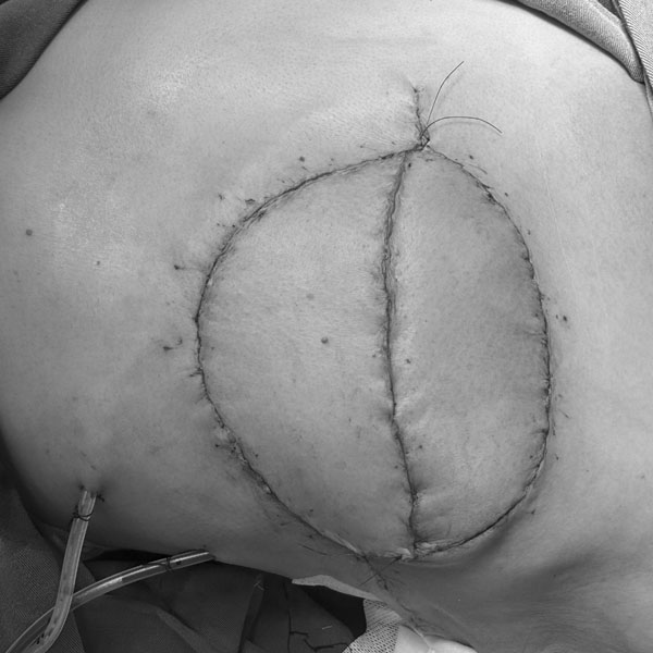 科室医务人员在讨论中表示,如果切除左侧乳房及全部受累皮肤,胸壁将留下巨大缺损;如果不切除受累皮肤,将面临极高的局部复发风险的情况,且此类患者术后需要放化疗,采取快速可靠方法修复创面缺损具有重要意义。考虑传统的背阔肌皮瓣因背部皮肤弹性较差,患者可能还需要再次进行植皮修复,回天立副主任医师提议为王女士进行左乳癌改良根治术+Kiss背阔肌皮瓣移植术,这样既能达到肿瘤的原发灶姑息性切除目的,又能避免低质量的植皮,为患者后续的放疗创造良好的条件。
