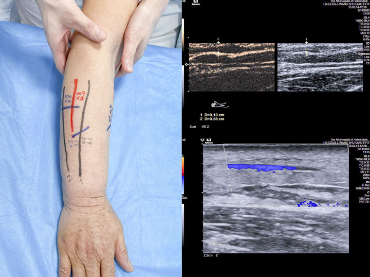 科室负责人纪晓惠将造影剂注射至自身体内,试验淋巴管超声造影技术