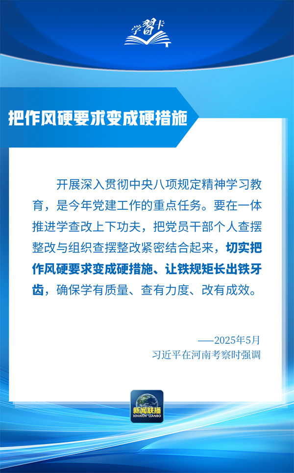 开展深入贯彻中央八项规定精神学习教育,是今年党建工作的重点任务。习近平总书记近日在河南考察时强调,切实把作风硬要求变成硬措施、让铁规矩长出铁牙齿。