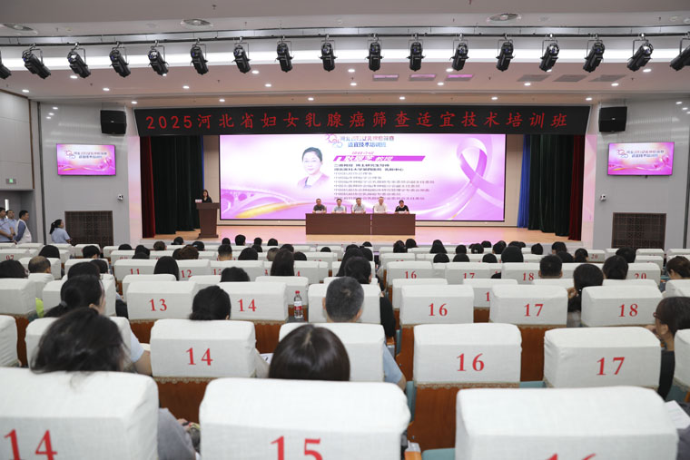 6月16-17日,由河北省卫生健康委妇幼处主办、我院承办的河北省2025年农村妇女乳腺癌检查项目培训班在我院举行。河北省卫生健康委妇幼健康处处长李保红,我院党委书记李立平、副院长彭利以及河北省乳腺癌防控技术培训基地负责人耿翠芝教授等出席。来自全省11个地级市及44个县(市)妇幼保健院的近百名乳腺癌筛查与诊治医务人员参与培训,旨在系统提升乳腺癌筛查与诊疗能力。