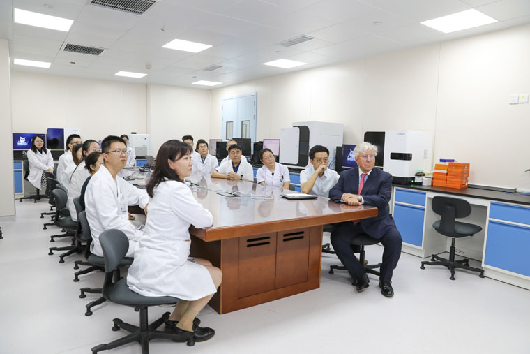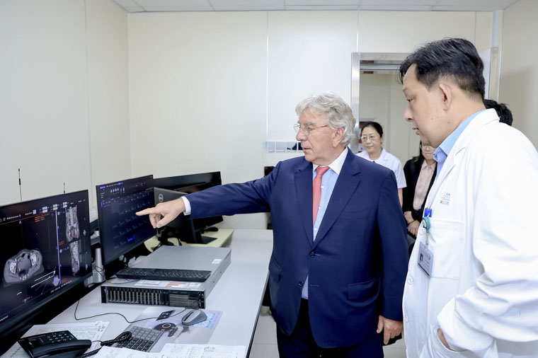 会前,Untch教授先后走访了东院区放疗科、病理科及乳腺中心临床研究病房。在放疗机房,他与医护团队围绕乳腺癌、宫颈癌患者放射治疗方案展开实时病例研讨;在河北省数智病理中心,对该中心基于超千万张病理图像构建的高质量数据集及高效处理多类临床诊断任务的AI模型给予高度评价,并肯定了远程病理会诊平台的建设成果。随后,Untch教授深入临床研究病房,对三位年轻晚期乳腺癌患者进行教学查房,以严谨的学术态度和人文关怀与患者沟通病情,提出国际化治疗建议,其专业素养获医患一致赞誉。