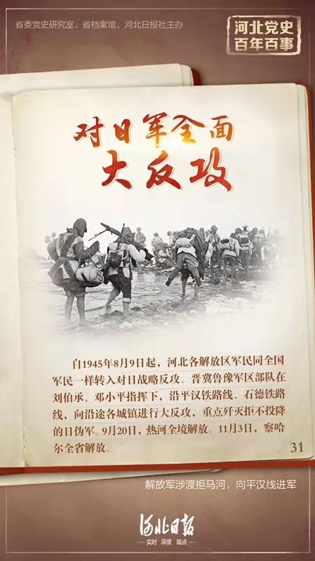 自1945年8月9日起,河北各解放区军民同全国军民一样转入对日战略反攻。晋察冀军区部队在聂荣臻的指挥下,迅速将38个小团扩编为大团,将地方武装编成62个团,使反攻的正规兵团扩大一倍。依据军区统一部署,晋察冀各解放区部队向日伪军占领的城镇全面发动进攻。晋冀鲁豫军区部队在刘伯承、邓小平指挥下,沿平汉铁路线、石德铁路线,向沿途各城镇进行大反攻。1945年9月2日,日本政府在投降书上签字,但被解放区部队包围的日伪军拒不投降。河北军民在保卫胜利果实的同时,重点歼灭拒不投降的日伪军。9月20日,热河全境解放。11月3日,察哈尔全省解放。北平、天津、保定、石家庄、唐山等大中城市,分别处于河北各解放区包围之中。