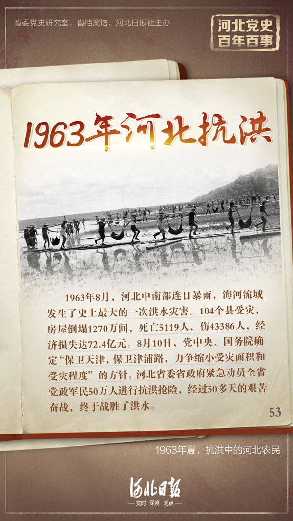 1963年8月,河北省中南部连日暴雨,海河流域发生了历史上最大的一次洪水灾害,部分中小型水库垮坝,子牙河、大清河、漳河等许多河段溃堤。104个县、26965个村庄受灾,受灾面积达5438万亩,房屋倒塌1270万间,死亡5119人,伤43386人,许多公路、铁路被冲毁,造成的经济损失达72.4亿元,洪水还严重威胁着天津市的安全。8月10日,党中央、国务院确定“保卫天津,保卫津浦路,力争缩小受灾面积和受灾程度”的方针。河北省委省政府紧急动员全省党政军民50万人进行抗洪抢险,人民解放军出动10万大军,四天之内空军出动飞机138架次,空投各类器材、食品数万公斤。海军也先后派出13艘舰艇营救群众。全国20多个省市自治区也全力支援河北抗洪。大批防汛救灾物资从四面八方运来,全国人民捐赠了大量的现金、粮票、粮食、衣物。在党中央的正确指导下,在全国人民的大力支援下,全省人民奋勇抗洪,涌现出许多可歌可泣的英雄人物和英雄事迹。经过50多天的艰苦奋战,终于战胜了洪水,保住了天津,最大限度地减少了灾害损失。