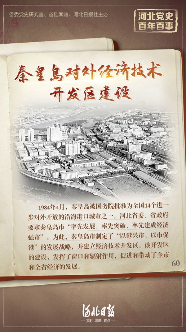 1984年4月,秦皇岛被国务院批准为全国14个进一步对外开放的沿海港口城市之一。河北省委、省政府要求秦皇岛市“率先发展、率先突破、率先建成经济强市”。为此,秦皇岛市制定了“以港兴市、以市促港”的发展战略,并建立经济技术开发区。该开发区的建设,发挥了窗口和辐射作用,促进和带动了全市和全省经济的发展。1986年7月31日,省政府召开加快秦皇岛经济技术开发区建设研讨会。1988年3月18日,国务院批准秦-唐-沧渤海湾为对外经济开放区。两年之后,河北省召开了对外开放工作会议,第一次正式提出全省对外开放。全省对外开放的步伐由此加快。