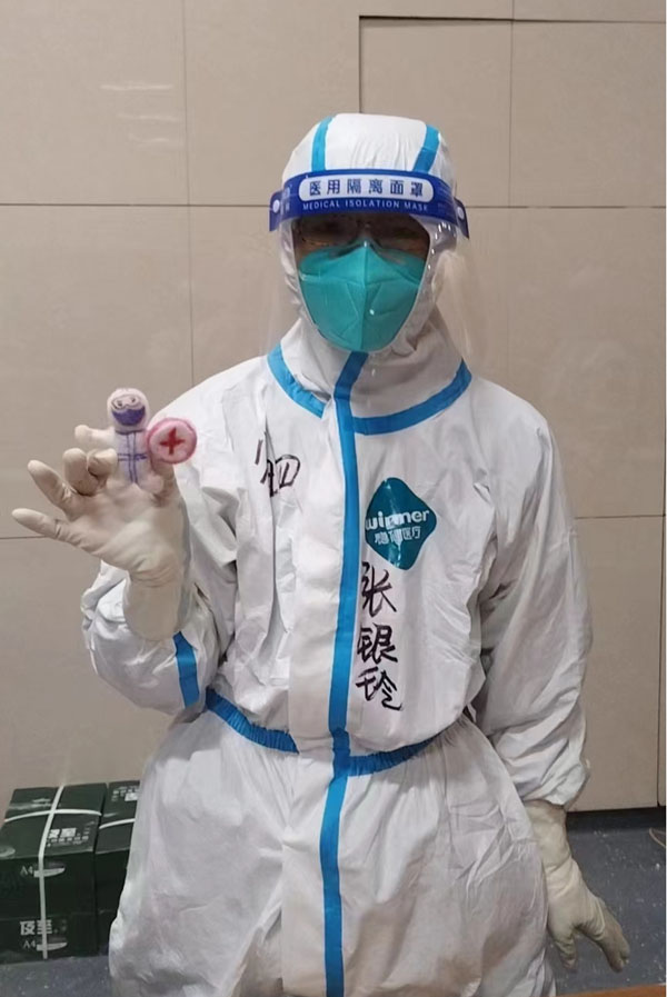刚进入方舱时,会有一部分患者对患病存在恐慌心理,处于一种过度紧张、焦虑的情绪中。药学部杨占云、产科张银玲和姐妹们除了坚守好每一班岗,2小时进舱巡视,对于重点、重症患者,详细询问病史、症状外,还积极做好患者的心理疏导。她们换位思考,对产生的焦虑不安的感染者给予充分的理解和心理支持,同时协调各方尽快解决他们的实际困难。随着不断梳理工作流程、打通工作堵点,优化解决方案,诉求量大大减少,一些患者感慨地说:“是你们的实际行动给我力量,我们也要用行动来战胜恐惧和焦虑。”