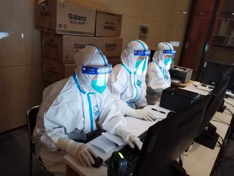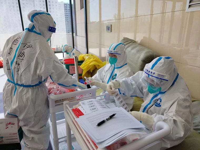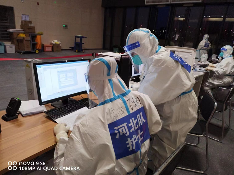 护理工作细致入微,遇到了与以往不同的挑战,习惯了全电脑操作的队员在条件有限的情况下又回归了“手工时代”。护理队长张缜、杨静从进舱的第一天开始,带领大家完善健康宣教、入院流程、表格标签等,大家群策群力,不断完善修订。从“采集核酸”这类高危操作到与志愿者为感染者发饭、协助清理生活垃圾,每一项琐碎的工作逐渐融入了日常的护理工作。全队上下逐渐形成默契,各自在岗位上尽最大努力把工作流程整理得更顺畅,绞尽脑汁完善每一个细节,把每一个感染者的护理做到最好。