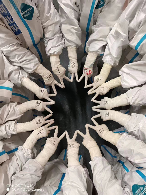 我院负责方舱内最大的区域X区,累及共收治患者2000多人次。感染者人数多,病情复杂,其中有怀孕5个多月先兆流产的孕妇,有几个月襁褓中的婴儿,有五六岁懵懂单纯的孩童,有八十多岁高龄的老人,有需要紧急抢救的重症病人……。每一天,医疗队员都穿着厚厚的防护服,守护着数百名患者,持续高负荷工作。在密不透风的包裹下,转身、低头这样的常规动作都显得尤为艰难;每个班次下来,护目镜布满了水雾,防护服里的洗手衣已经湿透。脱下防护服后,手上脚上都是红色的湿疹,痒到钻心……呼市的夜晚最低气温到了零下8-10度,大家冻得瑟瑟发抖,但依然笑称自己是寒夜中猫头鹰一样的守护者。
