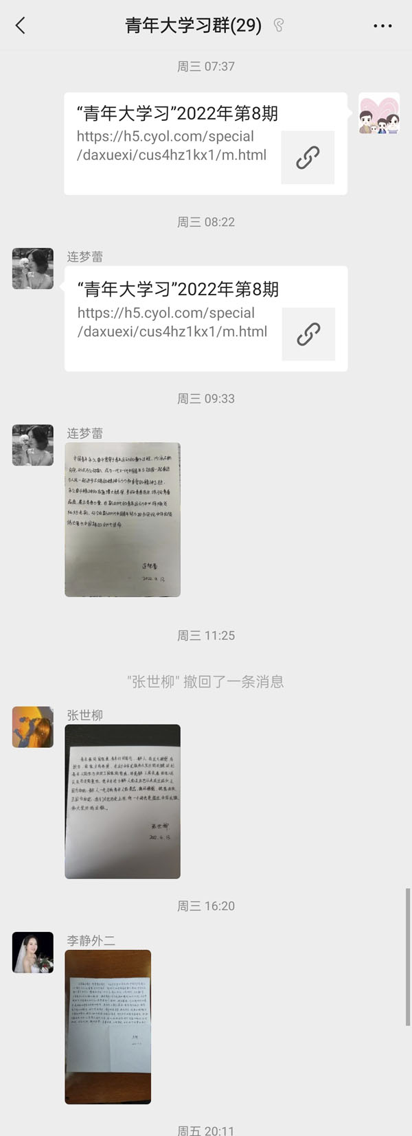 各团支部根据工作学习实际,组织团员青年们学习了我国首次专门就青年群体发布的《新时代的中国青年》白皮书,并结合“青年大学习”网上主题团课,围绕“党领导百年中国青年运动的重大成就和历史经验”进行了学习交流。团员青年们通过研读原文、撰写体会、网上答题等形式深入学习、交流心得,深刻感悟习近平总书记指引新时代中国青年运动蓬勃发展的伟大篇章。