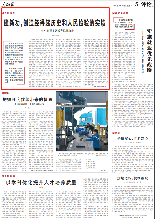 4月3日,学习贯彻习近平新时代中国特色社会主义思想主题教育工作会议在北京召开,习近平总书记强调,“我们要以这次主题教育为契机,加强党的创新理论武装,不断提高全党马克思主义水平,不断提高党的执政能力和领导水平”。4月11日起,《人民日报》评论版推出系列评论文章,深入阐释主题教育“学思想、强党性、重实践、建新功”的总要求。