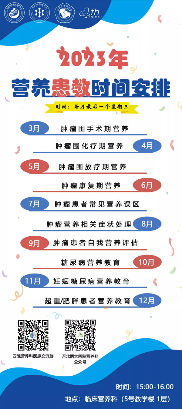 每月最后一个周三下午,临床营养科营养师会通过线上、线下相结合的形式,对广大患者进行营养患教,受众主要是肿瘤、糖尿病及超重/肥胖患者及家属。每月有1个不同的主题,包括肿瘤不同时期营养干预、营养误区、相关症状处理、自我营养评估及糖尿病、超重/肥胖患者营养教育等内容。患教活动旨在充分发挥临床营养科的力量,为我院广大患者及家属朋友们宣教营养知识,避开营养误区,辅助临床医生更好的治疗疾病。