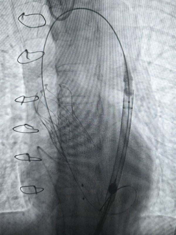 经过充分的术前准备,两台手术由心血管外科赵永波副主任主刀,赵伟超主治医师、侯五辉主治医师密切配合,选择经皮股动脉穿刺,预埋缝合器,术中反复造影,准确定位释放瓣膜,术后造影及超声提示人工瓣膜开启功能良好。为确保术中安全,体外循环小组全程保驾护航。患者生命体征平稳,术后一日均转出监护室。