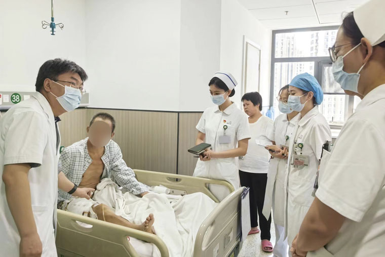 多日后,患者转入骨科接受相关治疗,以更好控制右下肢感染。荀建军主任、赵飞飞主治医师及骨科团队根据实际情况,请内分泌科置入胰岛素泵,严密科学控制血糖;针对患者心率快、咳嗽、喘憋等症状,请相关科室会诊,调整心肺功能,预防肺部感染。患者还存在胃部不适、尿频、尿急等情况,骨科分别请消化内科、泌尿外科、营养科等会诊,整体提升各器官功能,减少并发症,促进病人康复。在治疗期间,患者出现情感淡漠、焦虑等表现,荀建军主任敏锐察觉到病人存在大创伤后心因性抑郁和隐匿性抑郁,他指导患者口服抗抑郁药,调动医护人员开展情绪疏导等,有效平复了患者的消极情绪。在大家的共同努力下,病人的饮食、睡眠等情况明显好转。