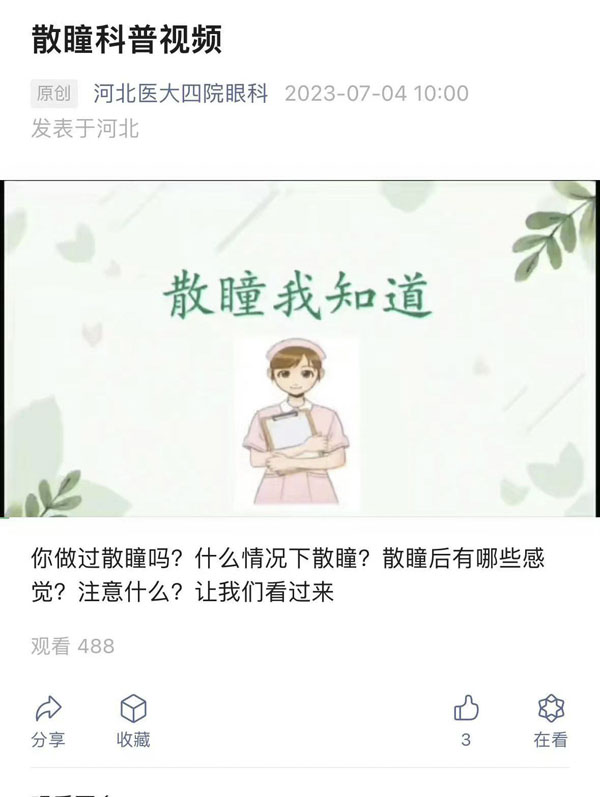 此外,团队制作了正确滴眼药水、预防跌倒、糖尿病视网膜病变、白内障、散瞳、斜视、近视、黄斑变性、视网膜脱离、青光眼等一系列科普视频,书写了多篇眼科常见疾病术后宣教、出院指导等科普文章,并有相应的宣教二维码、眼科公众号及视频号。
