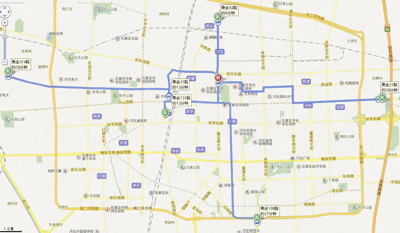 石家庄客运总站(解放广场)乘131路到省四院下车。