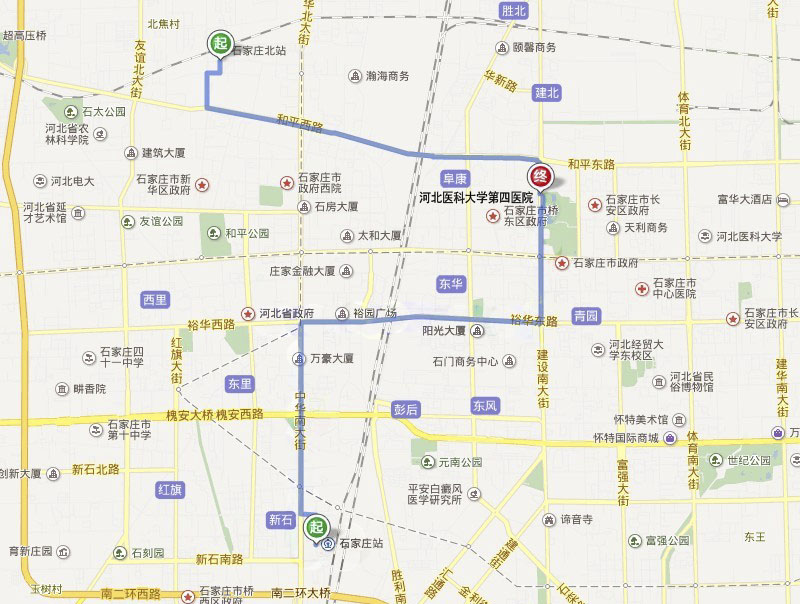 火车站乘92路到省四院下车,石家庄北站乘5路到省四院下车。或乘地铁2号线到长安公园站下车。